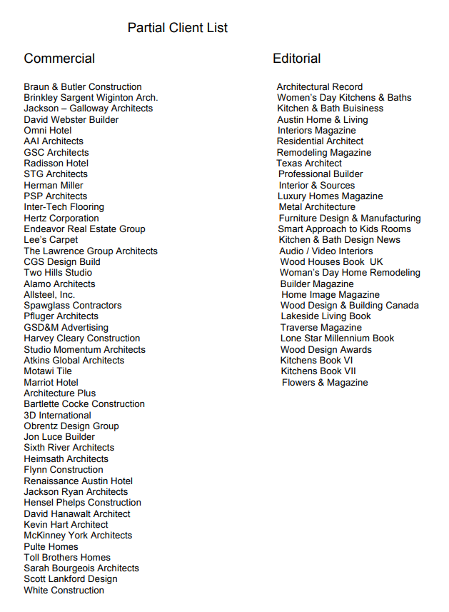 Peter has been photographing architecture for over 25 years. He’s based in Austin, Texas, but shoots projects from coast to coast. Peter photographs both commercial and residential projects of any size. His specialty is interior and exterior architectural photography. His clients tend to be architects, interior designers, builders and property managers. Together they collaborate to create award-winning images that stimulate his clients business. Years of experience allow him to quickly determine the best angles and lighting situations. Clients say he’s efficient and easy to work with. Peter has been a member of the American Society of Media Photographers (ASMP) for 23 years. His photographs have appeared in numerous local, regional and national building and design industry publications.